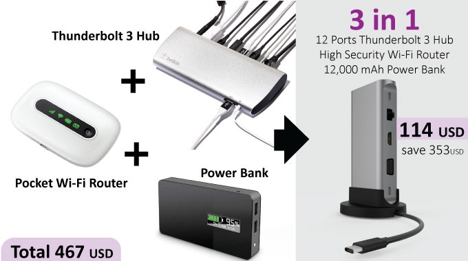 Unique 3-in-1 design for a portable USB-C Docking WorkstatioFinalHub is the only portable workstation that perfectly combines the features of a Thunderbolt 3 USB_C docking hub, a mobile pocket router, and a power bank. It’s designed so you can be safely connected and productive wherever you go.